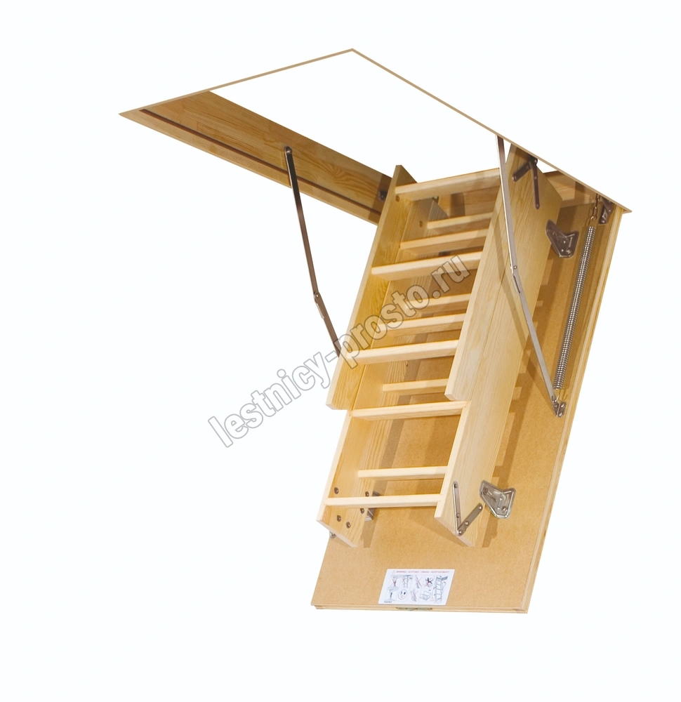 Деревянная чердачная лестница LWS изготовлена из древесины сосны и укомплектована утепленной крышкой, облицованной ДВП бежевого цвета (толщина крышки люка с утеплителем – 36 мм). Крышка люка крепится металлическими шарнирами, которые позволяют регулировать длину лестницы (макс. 40 мм). Для транспортировки лестница снижается в пазах, перед использованием необходимо отодвинуть лестничный марш от плиты люка.