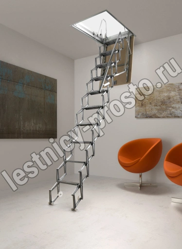 Автоматическая раздвижная ножничная чердачная лестница, с электромотором для дистанционного открывания.