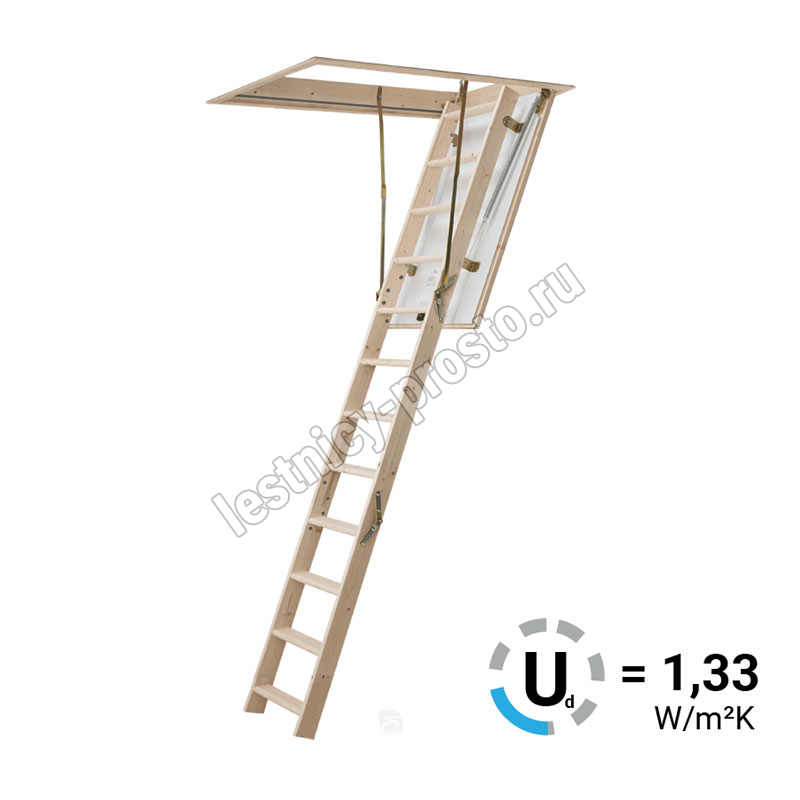 В комплекте: люк из сэндвич-панели, пружинный механизм "короб-люк", короб, трехсекционная лестница с сосновыми ступенями, замок люка, штанга для раскладывания лестницы.