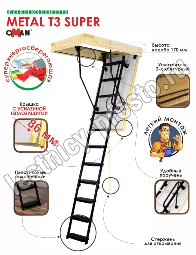 Лестница складная трехсекционная. Рабочая поверхность полностью выполнена из металла и покрашена порошковой краской. Термоизоляционная крышка типа "сэндвич", толщиной 86 мм, утеплена пенопластом, облицована с двух сторон ДCП белого цвета.