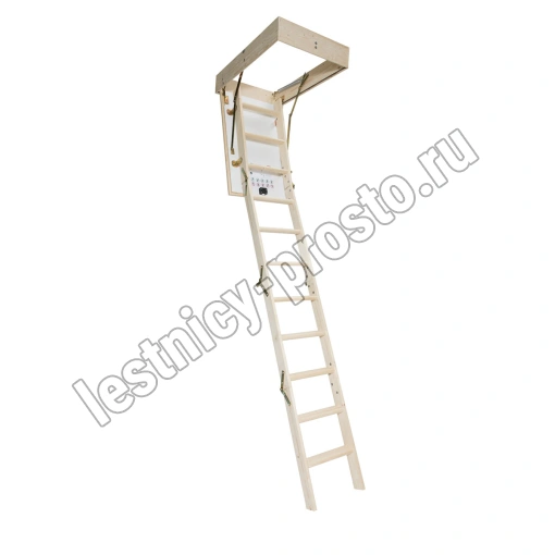 В комплекте: люк из сэндвич-панели, пружинный механизм "короб-рычаг", короб, четырехсекционная лестница с буковыми ступенями, замок люка, штанга для раскладывания лестницы, наконечники для ножек