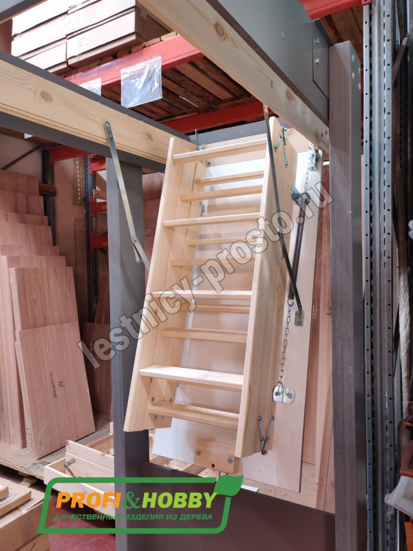 Простая и удобная чердачная лестница из сосны.