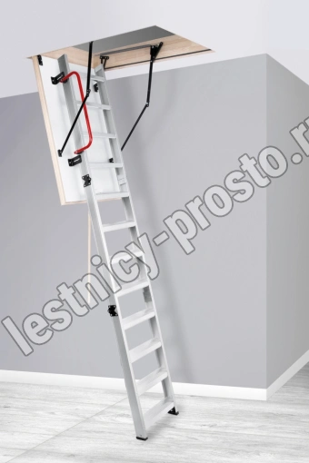 Складная 4-х секционная чердачная лестница. Рабочая поверхность полностью выполнена из алюминия. Термоизоляционная крышка типа "сэндвич" имеет усиленную теплозащиту, облицована с двух сторон ДВП белого цвета. По контуру короба имеется уплотнитель; Все металлические элементы лестницы покрыты порошковой краской.
