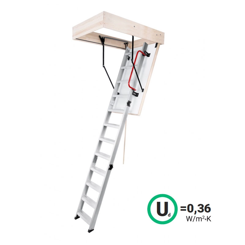 Лестница складная трехсекционная. Рабочая поверхность полностью выполнена из металла и покрашена порошковой краской. Термоизоляционная крышка типа "сэндвич", толщиной 47 мм, утеплена пенопластом, облицована с двух сторон ДCП белого цвета.
