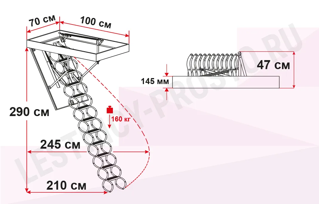 Все элементы лестницы выполнены из экологически чистых материалов и обработаны веществами, не содержащими тяжелых металлов. На ступенях антискользящие насечки. Короб лестницы изготовлен из металла. Термоизоляционная крышка типа "сэндвич" утеплена пенопластом, облицована с двух сторон ДСП белого цвета. Короб люка с уплотнителем. В комплекте деревянный стержень для открывания лестницы.