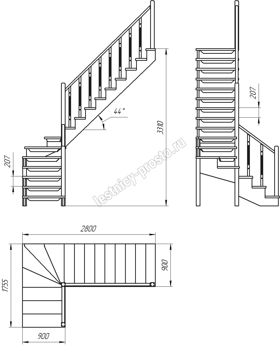 Деревянная межэтажная лестница ЛЕС-09 3310 проем 2800-900, Лиственница