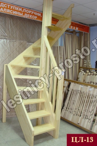 Компактная лестница из дерева. Удобный подъем засчет забежных ступеней и ограждений, которые входят в стандартную комплектацию. В стандартной комплектации столбы квадратные, балясины точёные. Элементы лестницы и ограждения поставляются в разобранном виде без какого-либо покрытия.