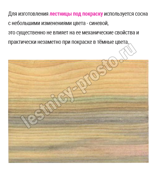 Для изготовления лестницы под покраску используется сосна с небольшими изменениями цвета - синевой, такой допустимый порок древесины существенно не влияет на ее механические свойства и практически незаметен при покраске в тёмные цвета.