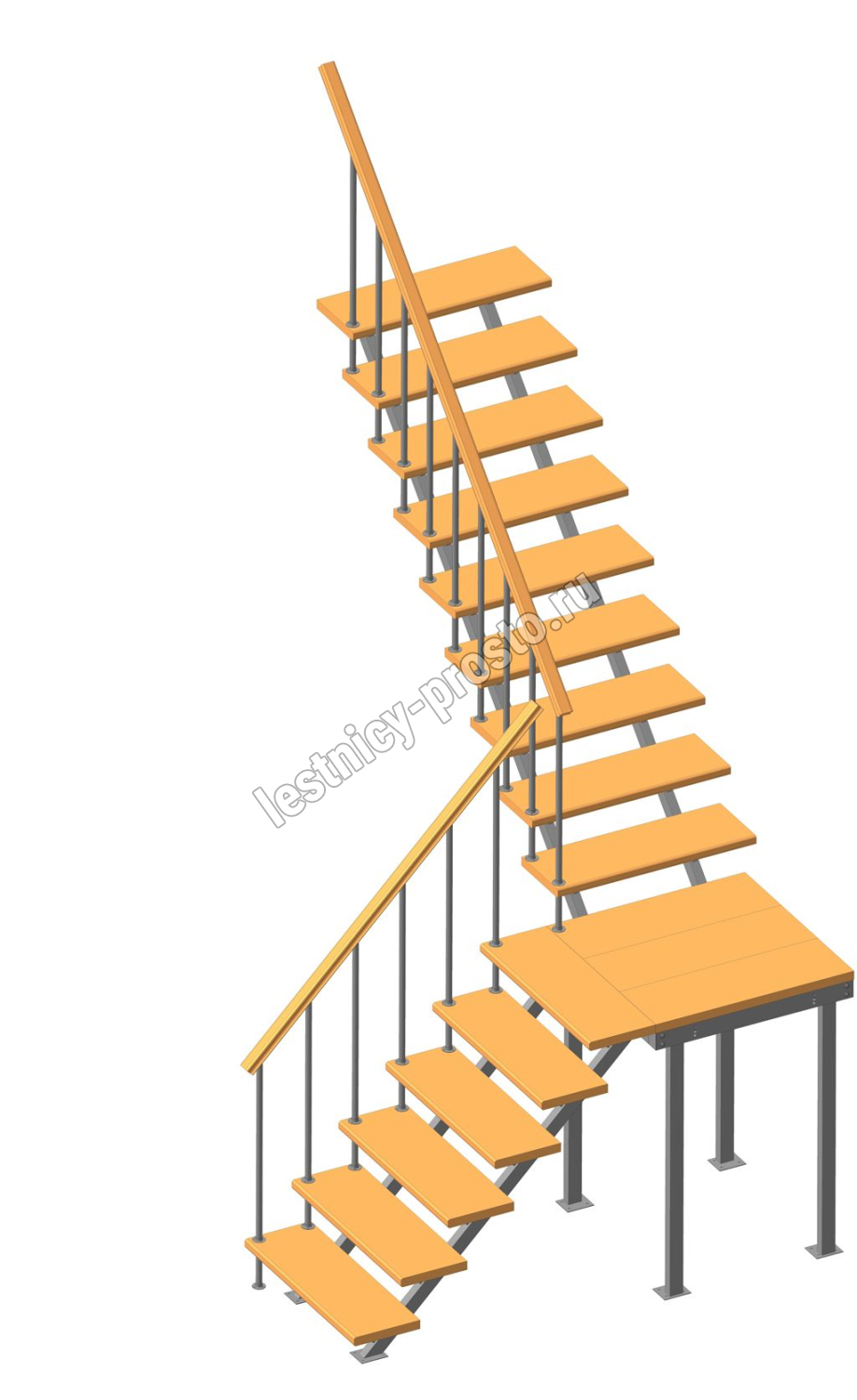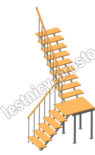 Универсальная лестница на металлическом каркасе с поворотной площадкой. Идеально дополнит любой интерьер, имеет современный вид и удобна в использовании. Монтаж осуществляется силами двух человек на объекте по указаниям, приведенным в паспорте на лестницу.
