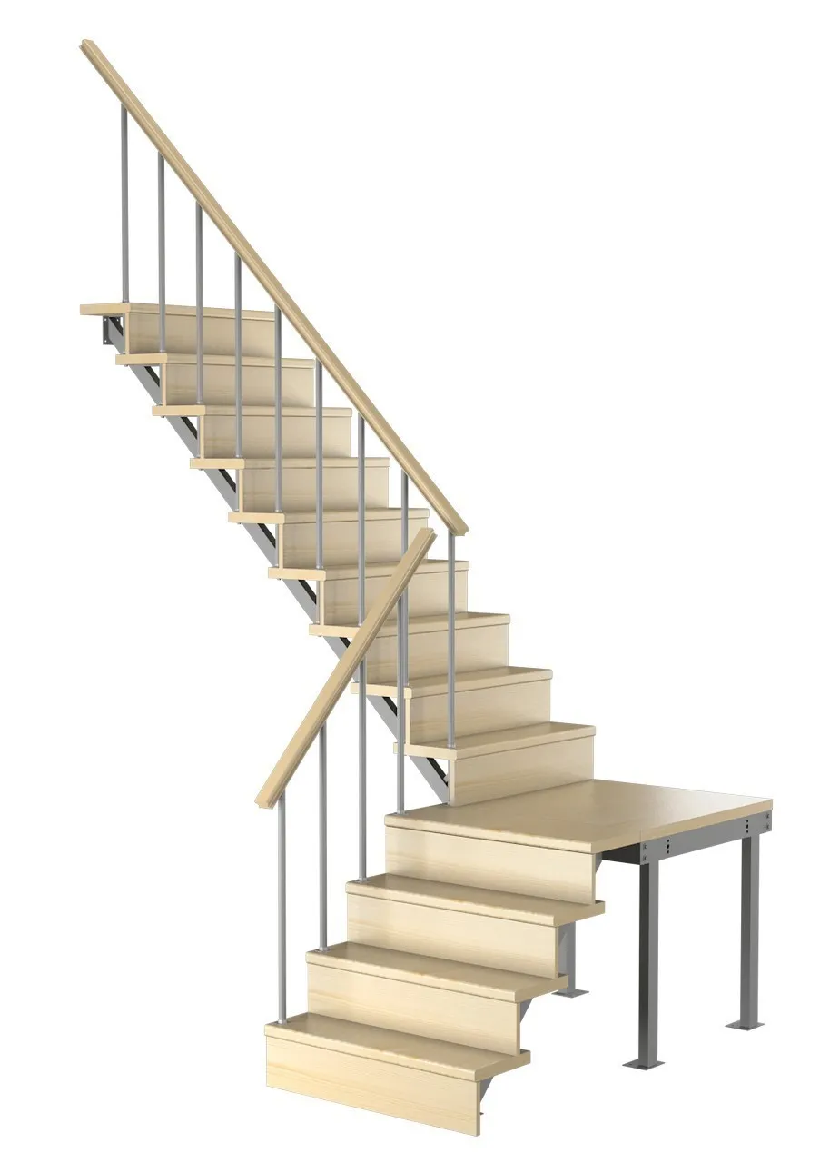 Универсальная лестница на металлическом каркасе с поворотной площадкой. Идеально дополнит любой интерьер, имеет современный вид и удобна в использовании. Монтаж осуществляется силами двух человек на объекте по указаниям, приведенным в паспорте на лестницу.