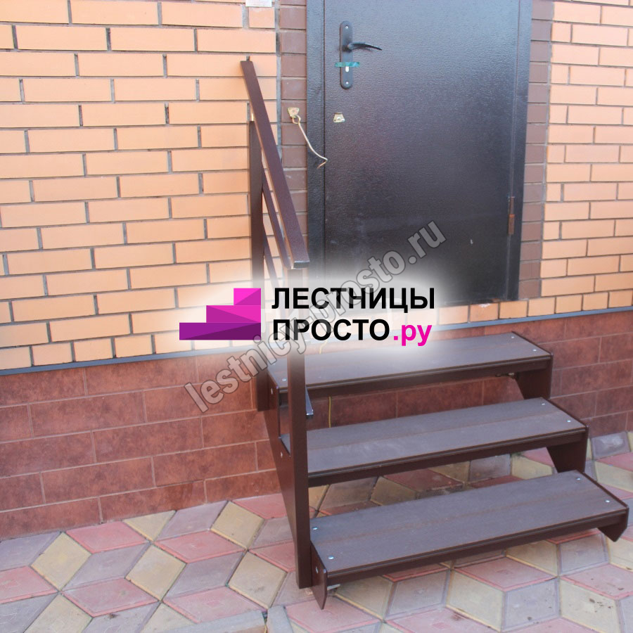 Ступени лестницы состоят из металлической рамки, обеспечивающей необходимую прочность, и покрытия из террасной доски ДПК (древесно-полимерный композит). Ступени не боятся воды и мороза, не теряют со временем свой внешний вид и не требуют ухода.