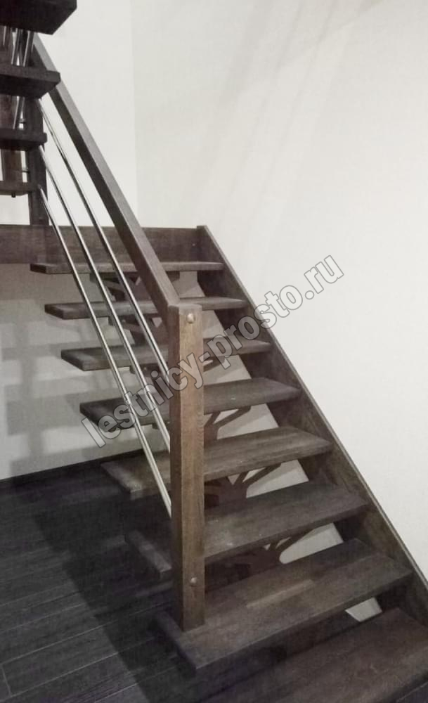 Ступени лестницы изготовлены из лиственницы категории А/В паркетной склейки без какого-либо покрытия. Вы можете заказать у нас предварительную профессиональную покраску деревянных элементов материалами БИОФА в широкий спектр цветов (стоимость зависит от количества ступеней).
