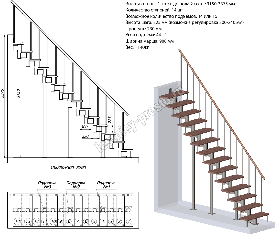 Универсальная, модульная лестница позволяет при сборке регулировать высоту шага в диапазоне 200 - 240 мм.