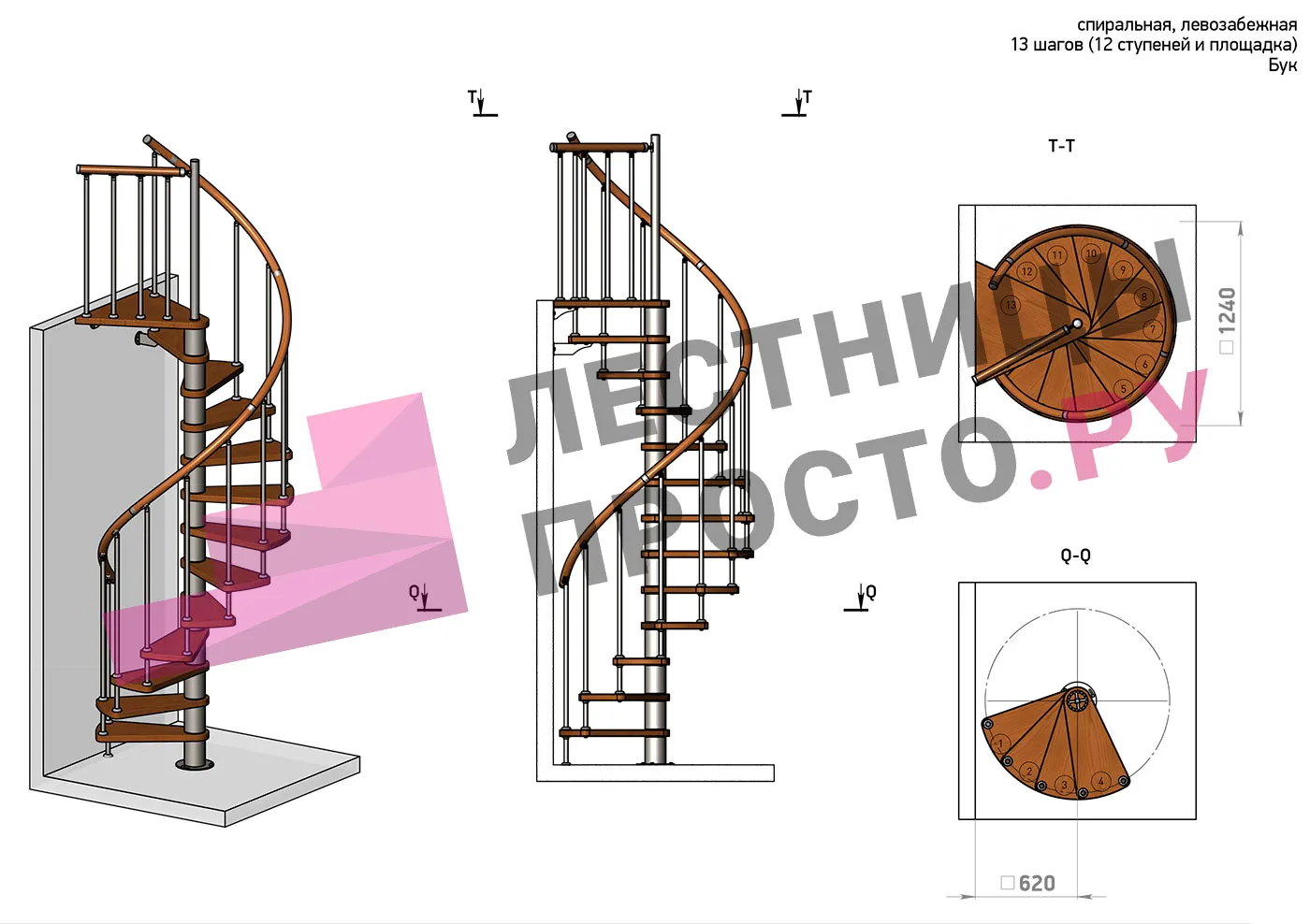 Винтовая лестница Prosto Spiral Black D120см, h282.2-326,3 см, бук