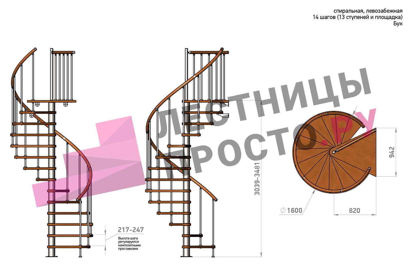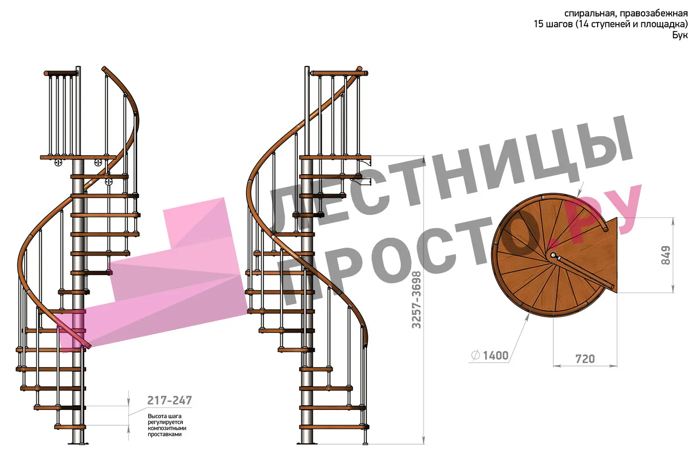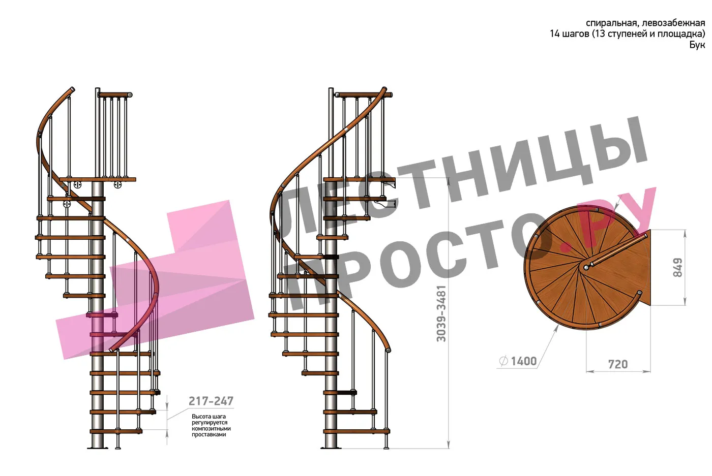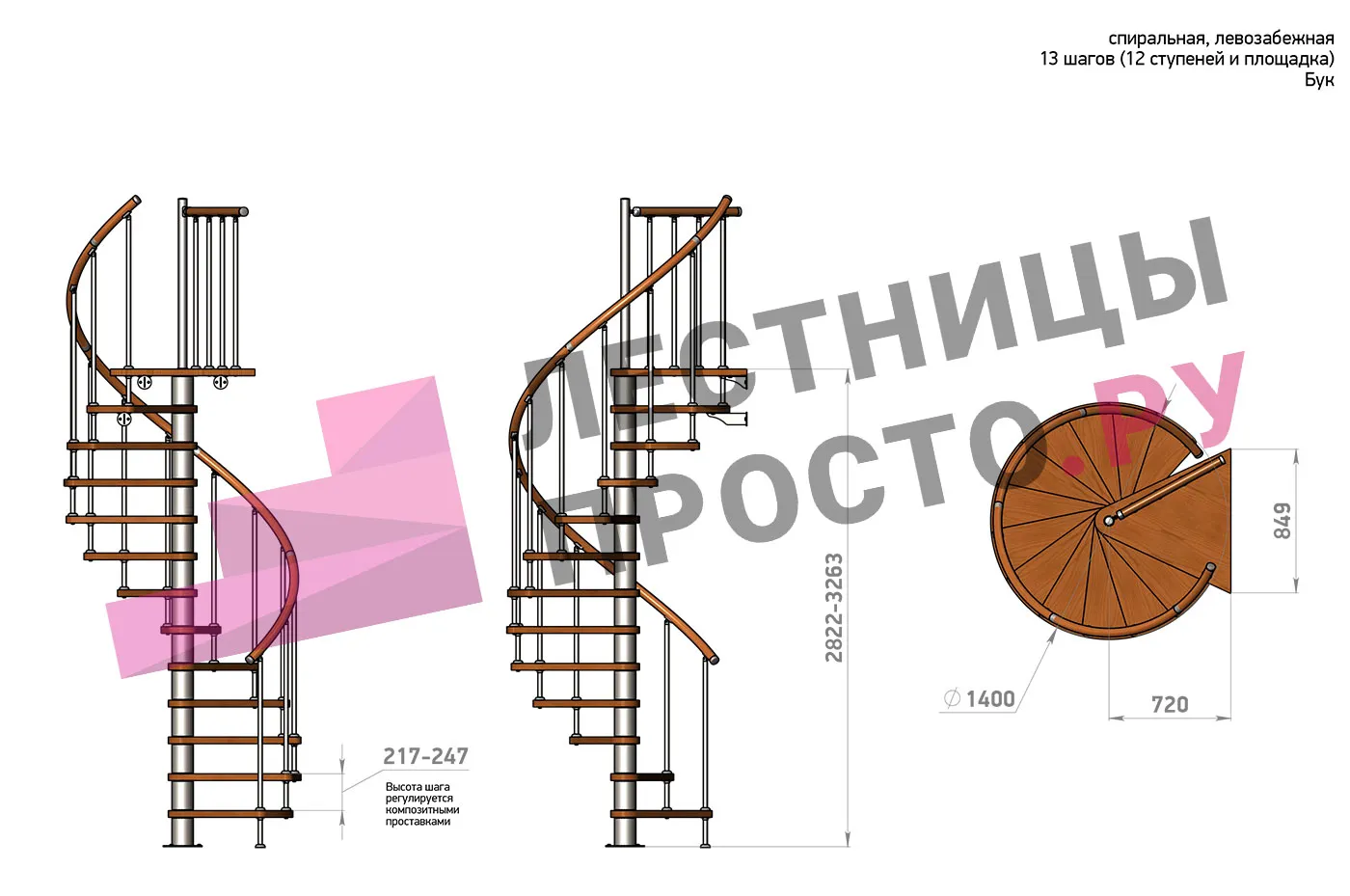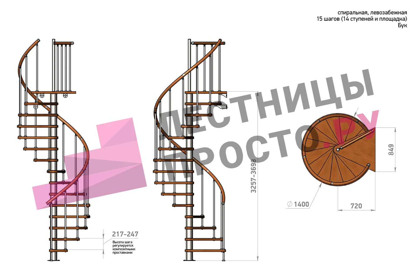 Высота ступеней регулируется с шагом 3 мм. в пределах 217-247 мм., благодаря чему, лестница прекрасно подгоняется под необходимую высоту.