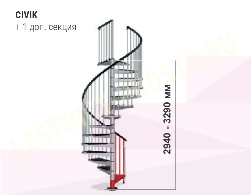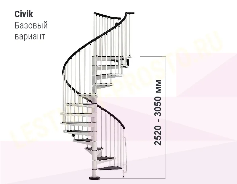 Ступени лестницы покрыты специальными накладками из износостойкого антискользящего материала. Площадка лестницы имеет универсальную форму, позволяющую встраивать лестницу в потолочные отверстия любой формы и размера. Высота лестницы регулируется при установке. С помощью специальных дополнительных секций, высоту лестницы можно увеличить до 3760 мм. (Секции покупаются отдельно). Во время сборки, задаётся необходимое направление поворота лестницы. CIVIK изготовлен из штампованной стали, окрашен в черный цвет (RAL 9017), белый (RAL 9010) или серый (RAL 9006). Отделка лестницы всегда в черном цвете. Перила из полиуретана с алюминиевым сердечником черного цвета, как и износостойкие нескользящие панели на ступенях.